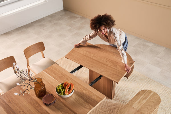 Notre collection comprend quatre configurations soigneusement conçues, adaptées à différents besoins, des configurations simples et quotidiennes aux plus grandes configurations conviviales. Composées de quatre ensembles de salle à manger extensibles, dont le Transformer Dining Set - The Practical, Transformer Dining Set - The Host, Transformer Dining Set - The Gathering et Transformer Dining Set - The Family, chaque ensemble est conçu pour évoluer avec votre espace.