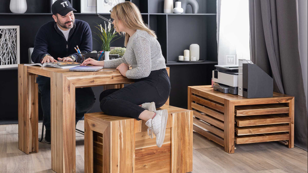 Lorsque vous étendez votre table en bois massif, soulevez les panneaux avec soin et assurez-vous qu’ils soient bien alignés avant d’asseoir vos invités. Rangez toujours les panneaux inutilisés dans un endroit frais et sec, ou dans l’une de nos solutions de rangement pratiques comme la Table Basse à Plateau Relevable ou le Buffet, afin de préserver à la fois leur beauté et leur fonctionnalité.