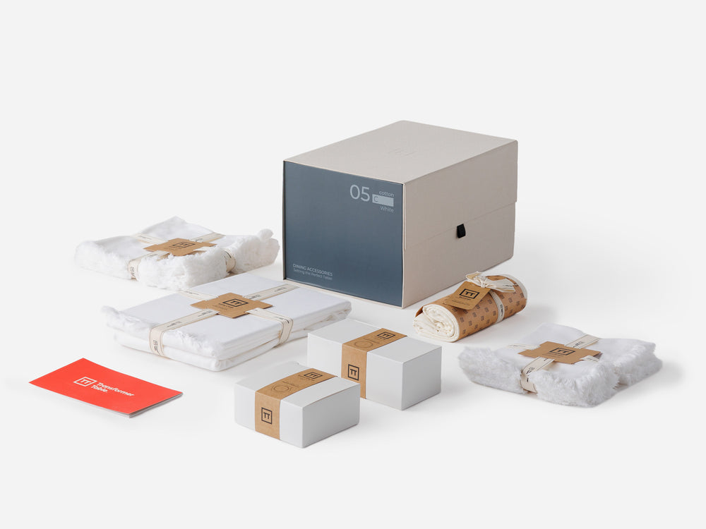 The Oeko-Tex certified Cotton Dining Accessory Box provides a full collection of coordinated essentials to help you set a clean and inviting table. It includes one cotton tablecloth (147 × 350 cm), one cotton table runner (35 × 350 cm), twelve cotton placemats (38 × 45 cm), and twelve cotton napkins (45 × 45 cm). You will also receive twelve wooden napkin rings, twelve matching wood coasters, and a styling lookbook to guide your table designs.